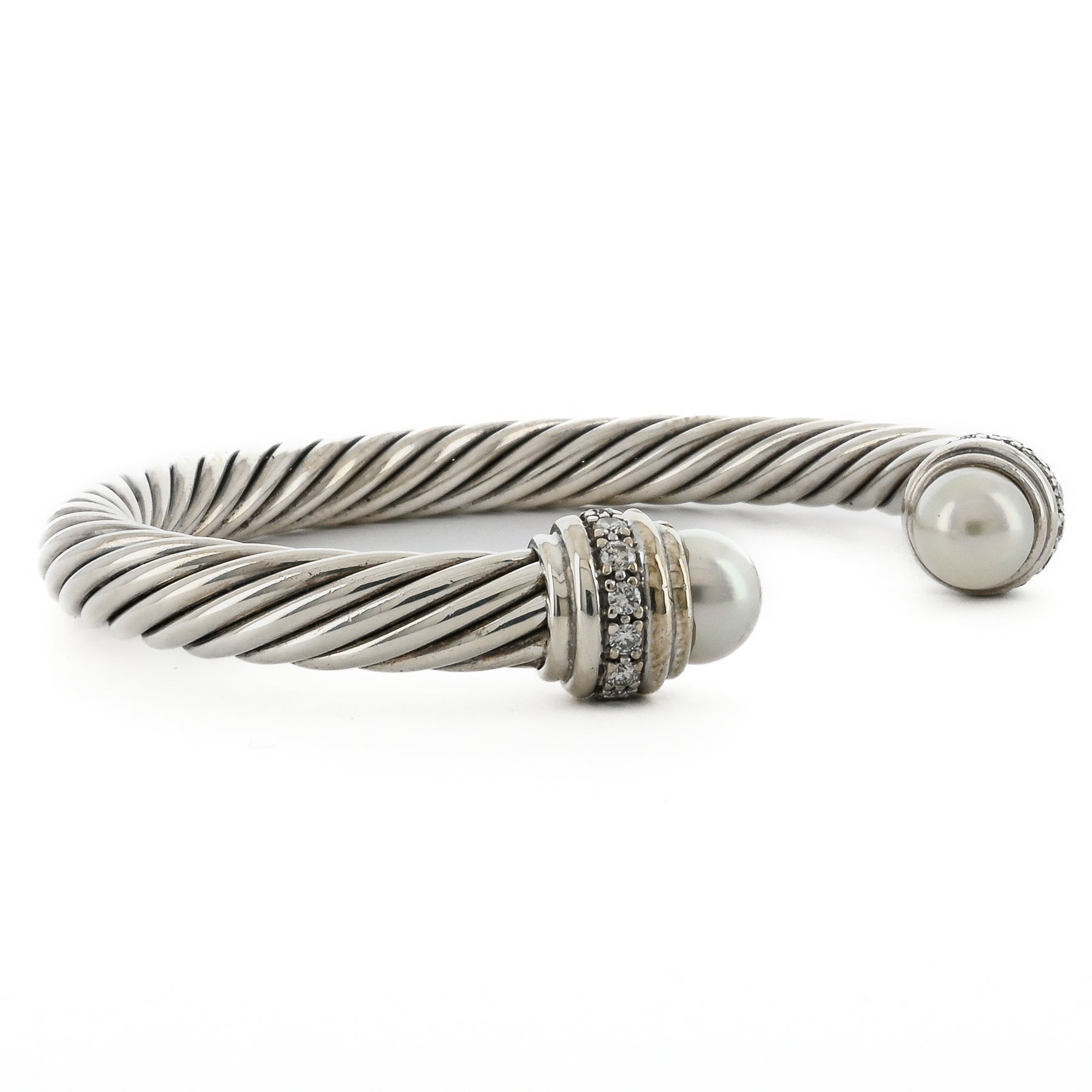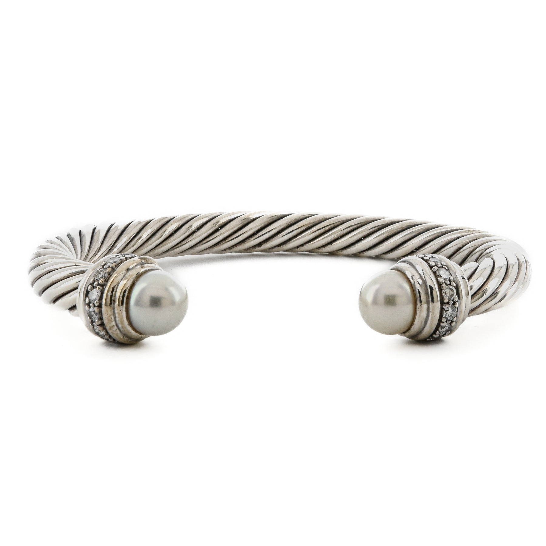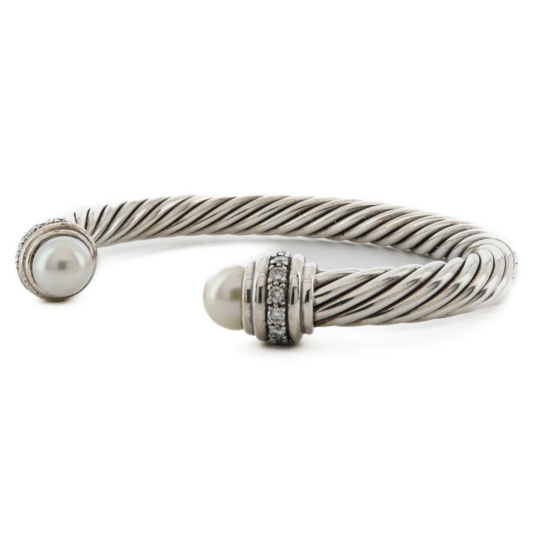 Introducing the pre-owned David Yurman Pearl and Natural Diamond Cable Bangle crafted with 925 Sterling Silver. This 7mm bracelet features pearls capping the ends of the bangle and encircled by round natural diamonds.