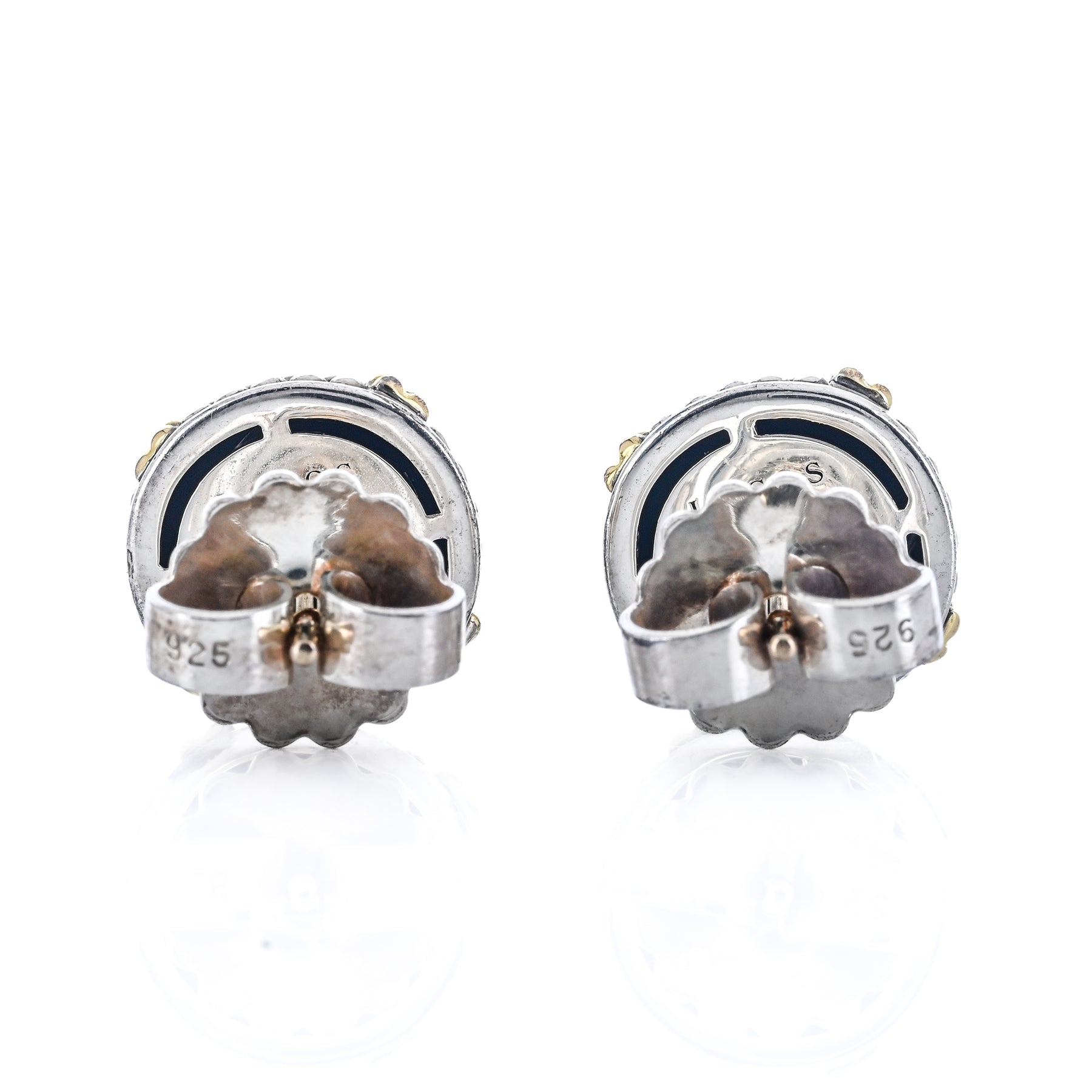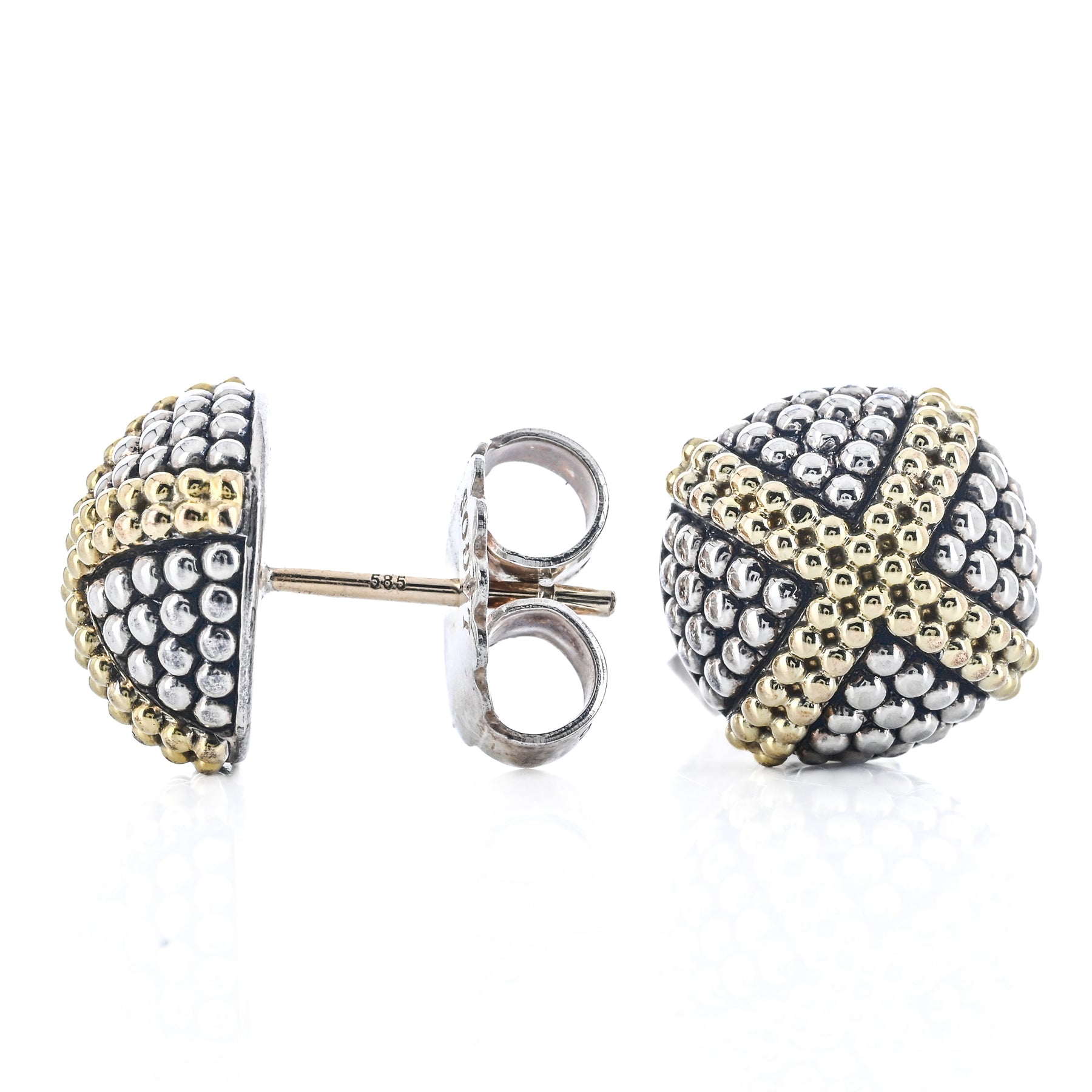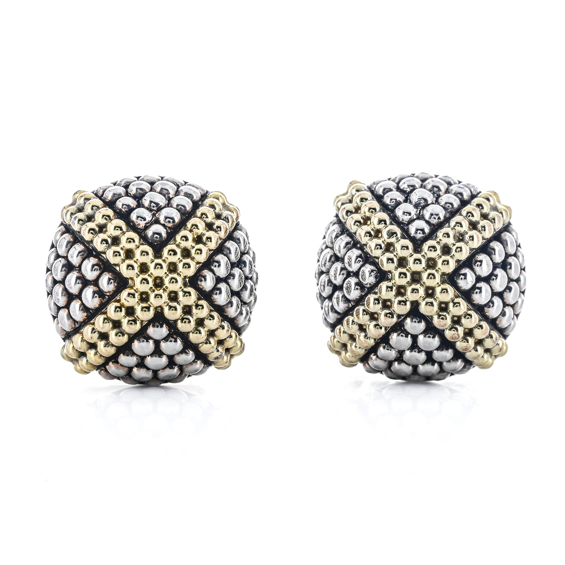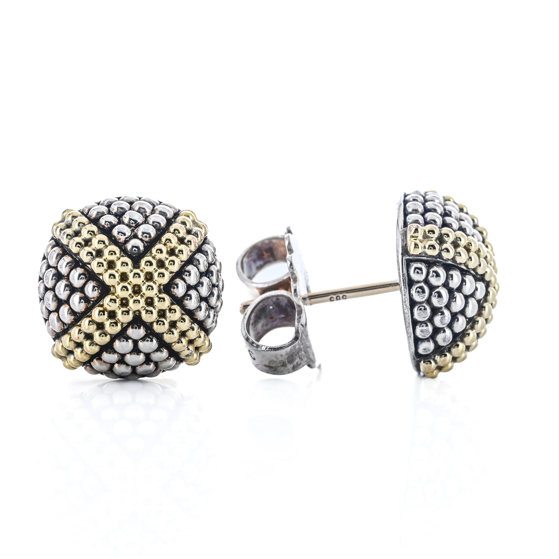 These estate LAGOS Signature X stud earrings are crafted in 925 sterling silver with 18K yellow gold accents. Featuring the iconic X motif, they offer a bold yet elegant design perfect for everyday wear.