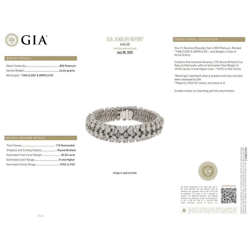 Experience the timeless elegance of this vintage Van Cleef & Arpels diamond bracelet, crafted in 950 platinum. With an impressive 35.5CTW, this bracelet boasts 170 meticulously set round diamonds, each radiating a captivating sparkle. The diamonds, graded G-H in color and VS+ in clarity, offer remarkable brilliance and pristine quality, enhancing the bracelet’s luxurious allure. Designed by the renowned house of Van Cleef & Arpels, this piece combines classic sophistication with unmatched craftsmanship, making it a true statement of refined luxury and enduring beauty. Indulge in an heirloom-quality piece that elevates any occasion.