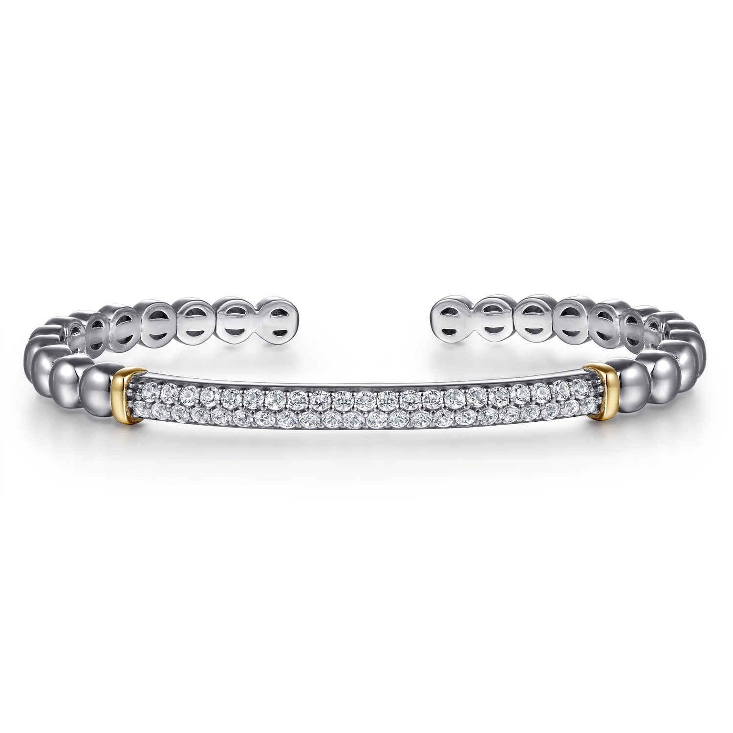 Presenting the White Sapphire Open Bangle, crafted in 925 sterling silver. This open bangle features a double row pavé-set bar of white sapphires, complemented by larger Bujukan beaded detailing and accented with touches of yellow gold.